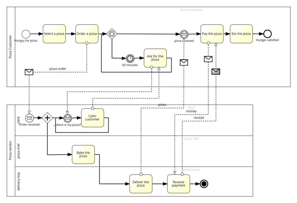 - Nein-Pfad: Wenn die Qualität nicht in Ordnung ist, führt der Kontrollfluss zu „Pizza neu backen“ (ein Schleifenpfad zurück zum Schritt 2) oder „Bestellung stornieren“ (ein Endereignis).