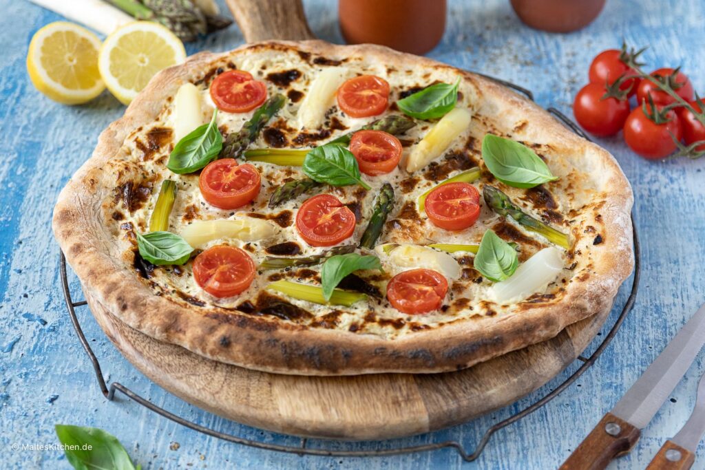 Ein Tipp: Blanchieren Sie den grünen Spargel kurz (ca. 2-3 Minuten) in Salzwasser, bevor Sie ihn auf die Pizza legen. Das sorgt dafür, dass er beim Backen perfekt gar wird und seine leuchtend grüne Farbe behält.