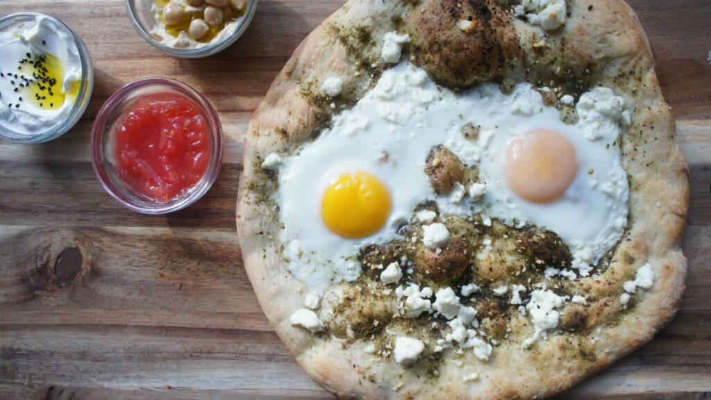 Sabich ist ein weiteres beliebtes Streetfood-Gericht, das oft zum Frühstück oder als schneller Snack gegessen wird. Es ist die vegetarische Antwort auf Shawarma und besteht aus einem dünnen Fladenbrot, das auf einer heißen Platte oder einem Grill leicht geröstet und dann gefüllt wird. Die klassische Füllung umfasst gegrillte Auberginen, hartgekochte Eier, Tahini-Sauce, Tomatensauce (oder frische Tomatenwürfel), gehackte Gurken und oft auch Amba (ein Mangodip). Die Kombination aus den verschiedenen Texturen und Geschmäckern – cremig, knusprig, würzig und frisch – macht Sabich zu einem einzigartigen und sättigenden Erlebnis.