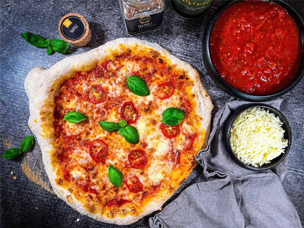 | Belag | Deftig, üppig, oft unkonventionell (Ananas, Döner, Sauerkraut) | Weniger ist mehr, frische, hochwertige Zutaten (Basilikum, Rucola, Prosciutto nach dem Backen) |