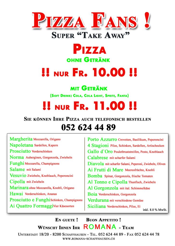 | Romana-Pizzapass | CHF 100.– | 12 Pizzen | 2 Pizzen gratis | CHF 120.– |