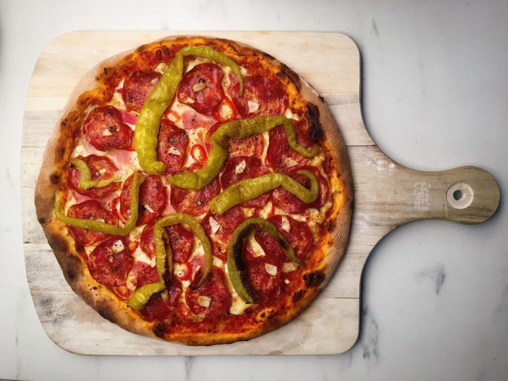 Ein kleiner Trick: Wenn Sie Salami verwenden, legen Sie diese erst in den letzten 2 Minuten der Backzeit auf die Pizza. So bleibt sie saftig und verbrennt nicht. Die Pizza ist fertig, wenn der Rand goldbraun und knusprig ist und der Käse schön geschmolzen und leicht gebräunt ist.