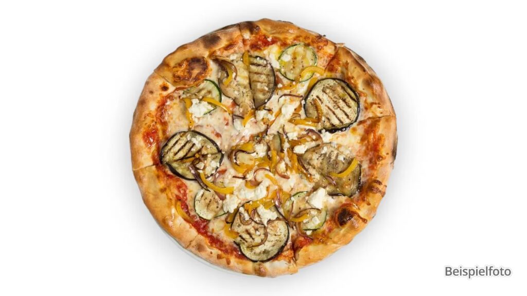 - Pizza mit Gemüse: Eine vegane Pizza, großzügig belegt mit frischem saisonalem Gemüse und Knoblauch.