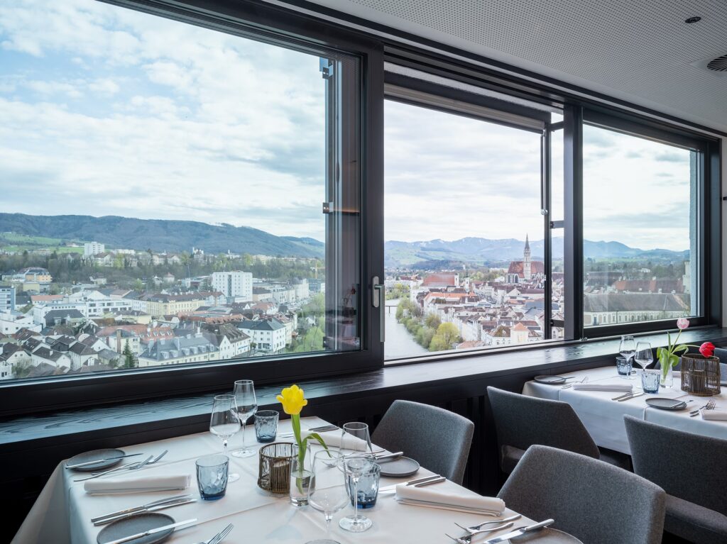 Der Name „über den Dächern von Steyr“ ist Programm. Das Restaurant bietet nicht nur exquisite Speisen, sondern auch eine atemberaubende Aussicht über die historische Stadt. Diese einzigartige Lage schafft ein Ambiente, das seinesgleichen sucht. Ob bei strahlendem Sonnenschein, der die Stadt in goldenes Licht taucht, oder bei Einbruch der Dämmerung, wenn die Lichter Steyrs zu funkeln beginnen – der Blick ist stets faszinierend und trägt maßgeblich zum Gesamterlebnis bei. Die Inneneinrichtung ist elegant und modern, dabei aber gemütlich und einladend gestaltet. Große Fensterfronten sorgen dafür, dass die Gäste die Panoramaaussicht in vollen Zügen genießen können, während sie in einer ruhigen und stilvollen Atmosphäre speisen. Diese exklusive Atmosphäre macht das Restaurant zum idealen Ort für Geschäftsessen, romantische Rendezvous oder einfach eine Auszeit vom Alltag.