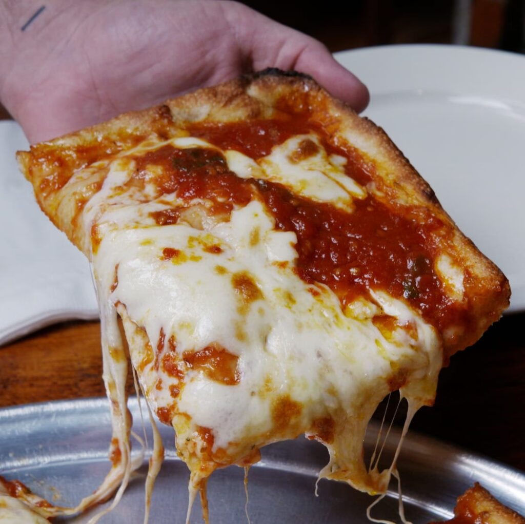 - Grandma-Style Pizza: Der Teig einer Grandma-Pizza wird ebenfalls in einem mit Olivenöl ausgekleideten Blech gestreckt. Allerdings erhält der Grandma-Teig nur eine kurze Gehzeit, was ihm eine dünnere und dichtere Kruste verleiht als seinem sizilianischen Vetter. Das großzügige Bestreichen mit Olivenöl beim Backen sorgt nicht nur dafür, dass die Pizza nicht am Metall kleben bleibt, sondern macht auch die untere Schicht der Kruste knusprig und verleiht ihr den köstlichen Geschmack von gebratenem Brot, während es eine stabile Struktur für Käse und Soße darüber schafft.