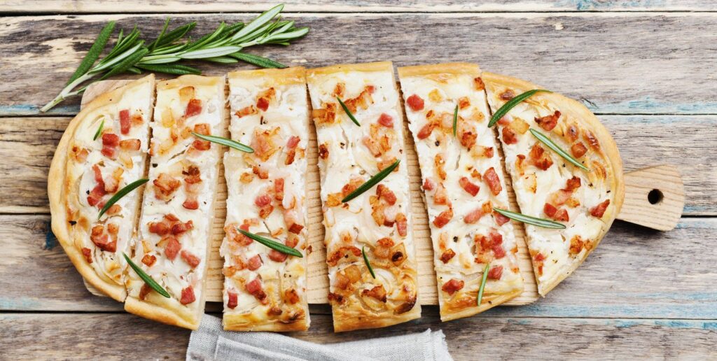 Auch der Belag unterschied sich ursprünglich sehr stark und spiegelte die regionalen Gegebenheiten wider. Der traditionelle Flammkuchen wurde mit einer Mischung aus Crème fraîche oder weißem Käse (Quark), dünn geschnittenen Zwiebeln und kleinen Speckwürfeln (Lardons) belegt. Diese Zutaten waren in den ländlichen Haushalten des Elsass leicht verfügbar und spiegelten die Einfachheit und Robustheit der regionalen Küche wider. Es gab keine Tomatensauce und selten Käse im Überfluss, da der Fokus auf dem Zusammenspiel von der cremigen Basis, der Schärfe der Zwiebeln und dem salzigen Speck lag.